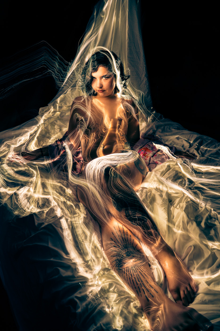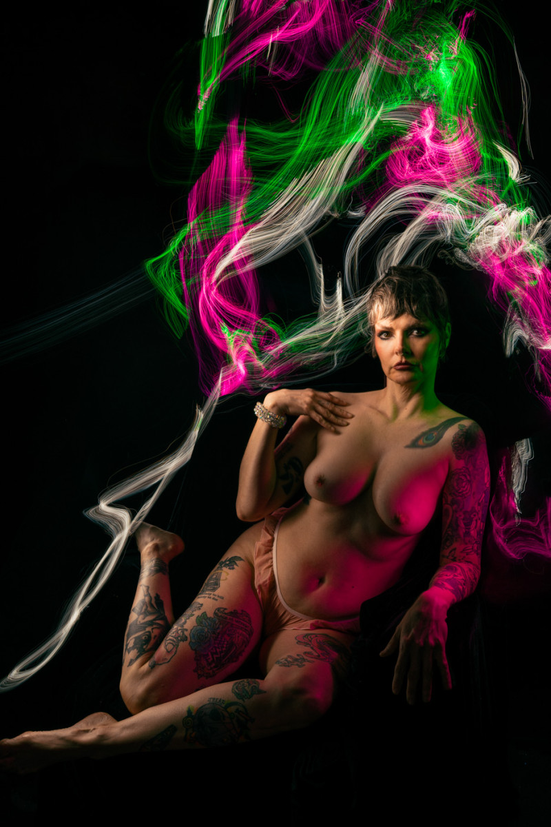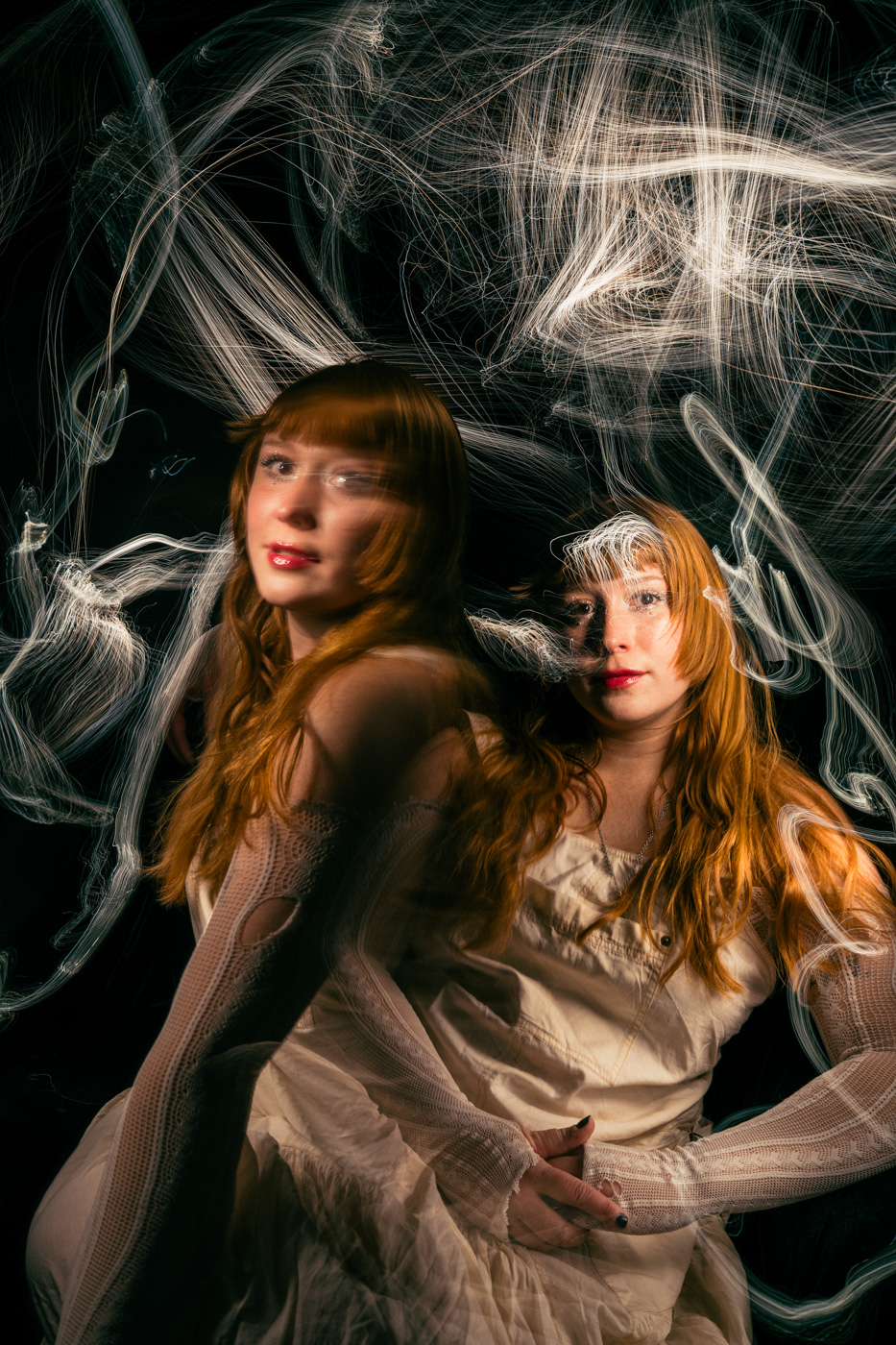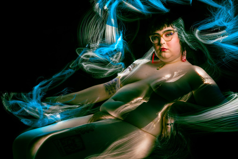 I have long been fascinated by photography’s relationship to time. In these portraits, I work in darkness, moving small light sources across the body during a single exposure. The resulting images gather multiple moments into one frame, allowing the body to exist in overlapping times and spaces. What appears is not a record of a single instant, but a composite formed through duration—an image shaped by movement, accumulation, and delay.