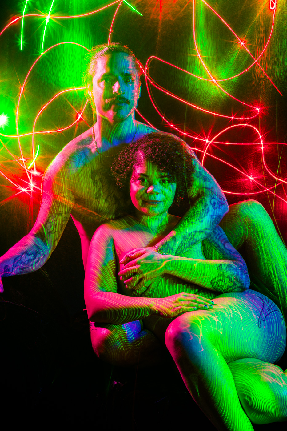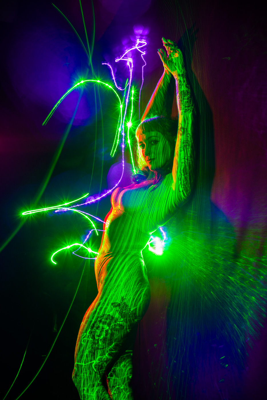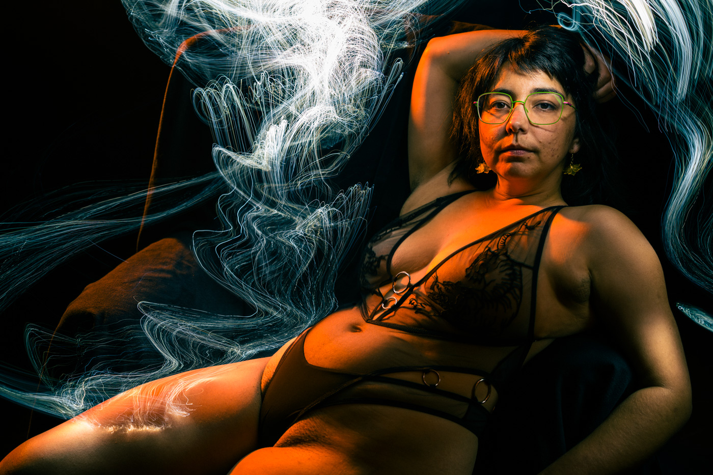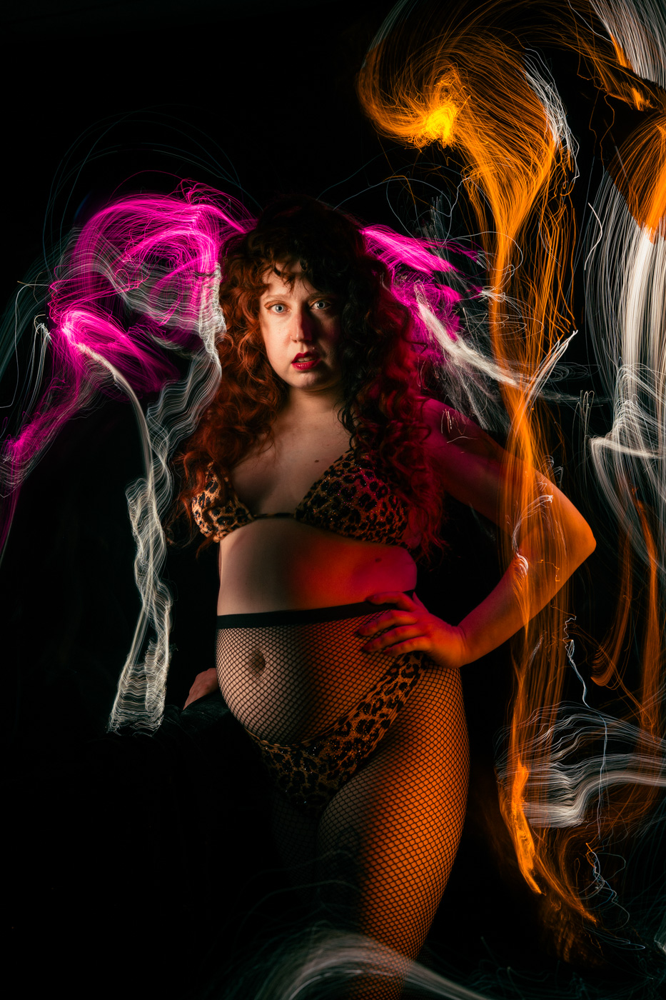 I have long been fascinated by photography’s relationship to time. In these portraits, I work in darkness, moving small light sources across the body during a single exposure. The resulting images gather multiple moments into one frame, allowing the body to exist in overlapping times and spaces. What appears is not a record of a single instant, but a composite formed through duration—an image shaped by movement, accumulation, and delay.