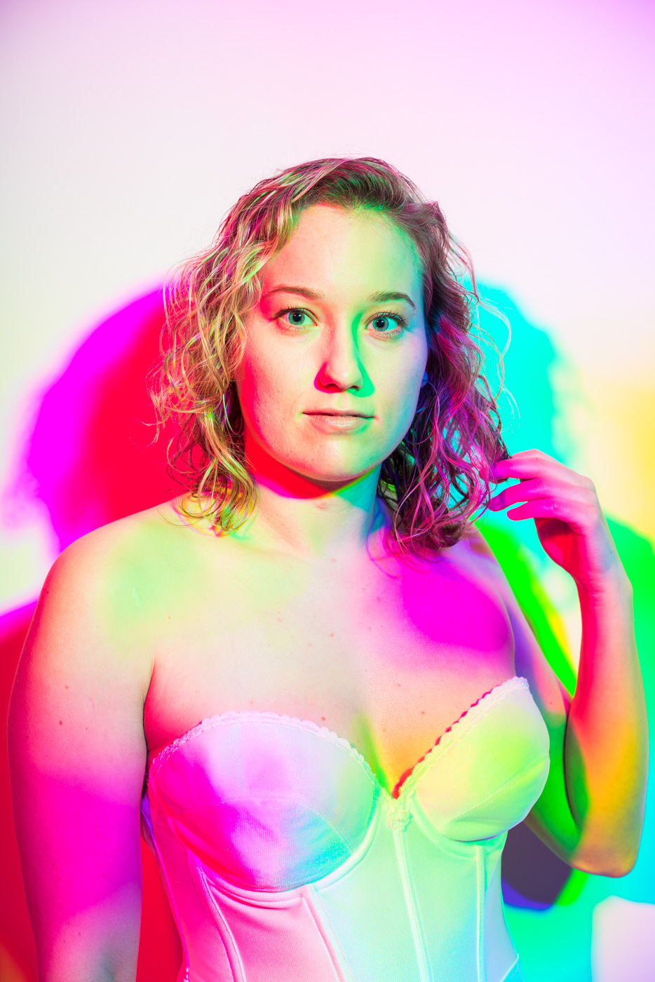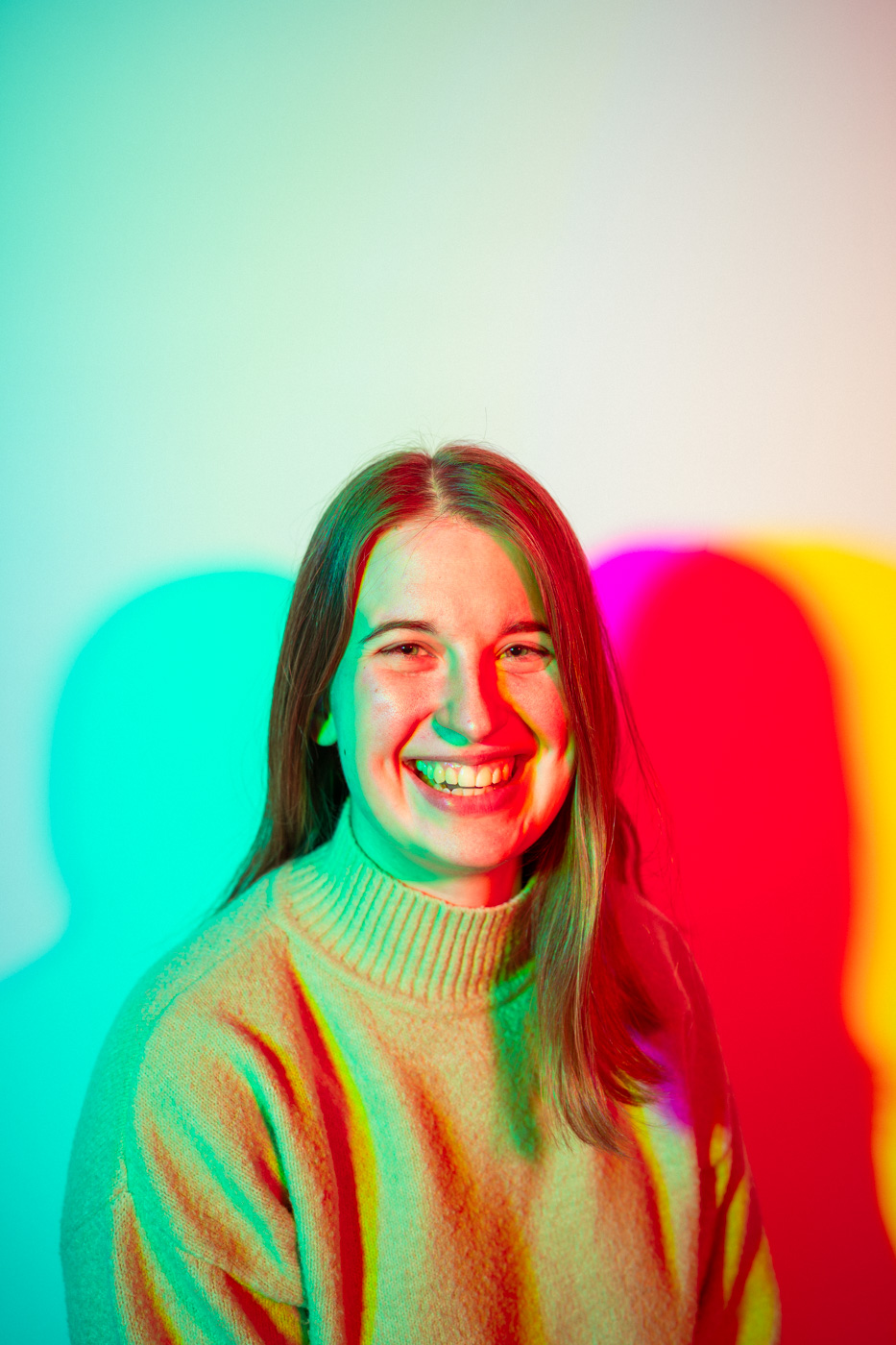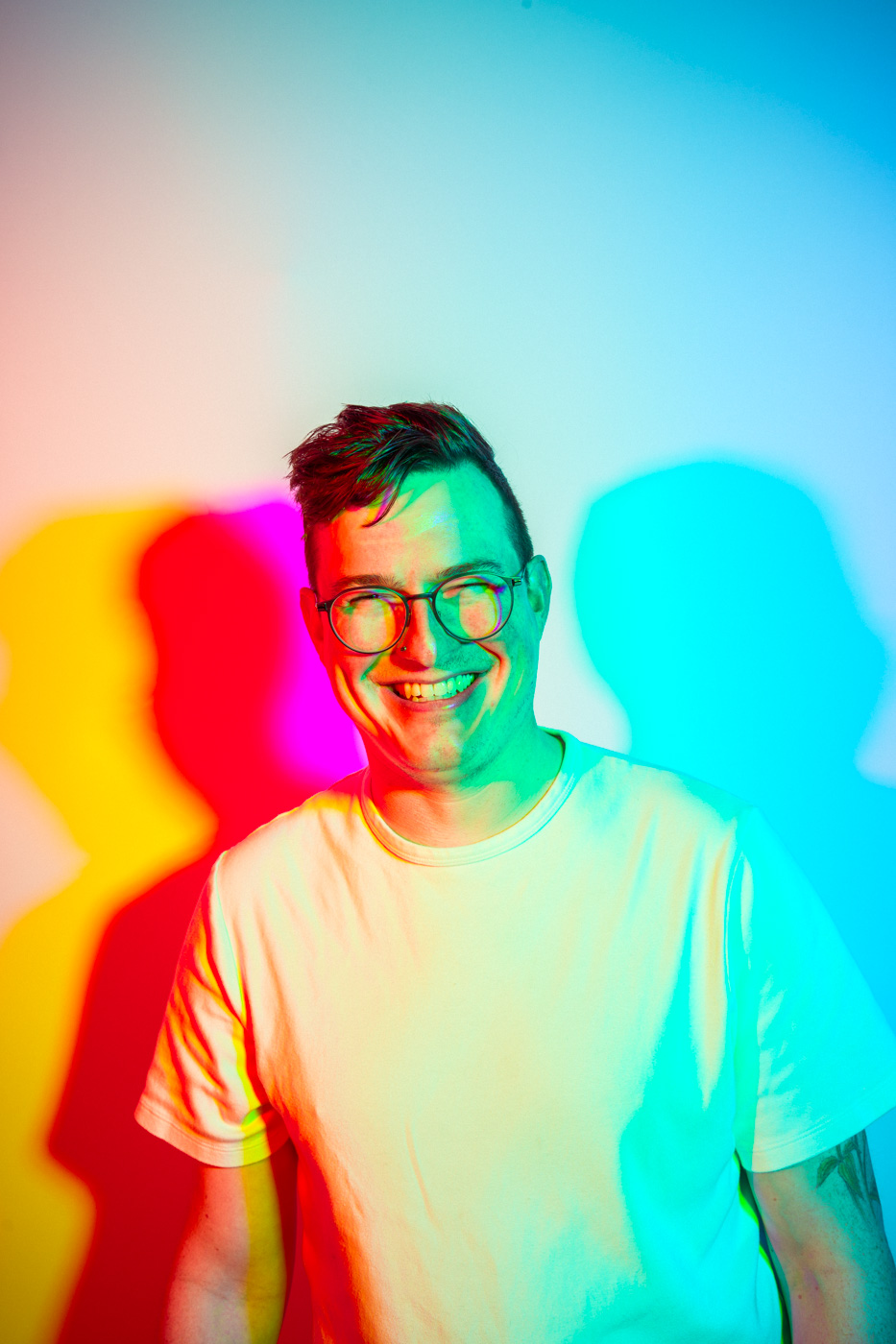 White light, as the human eye understands it, is composed of equal parts red, green, and blue. By isolating and recombining these colors in the studio, I can paint with light itself—an intentionally unstable palette that resists full control. In these portraits, shadows split and recombine, drifting in color around the body and allowing chance to shape the image as much as intention.