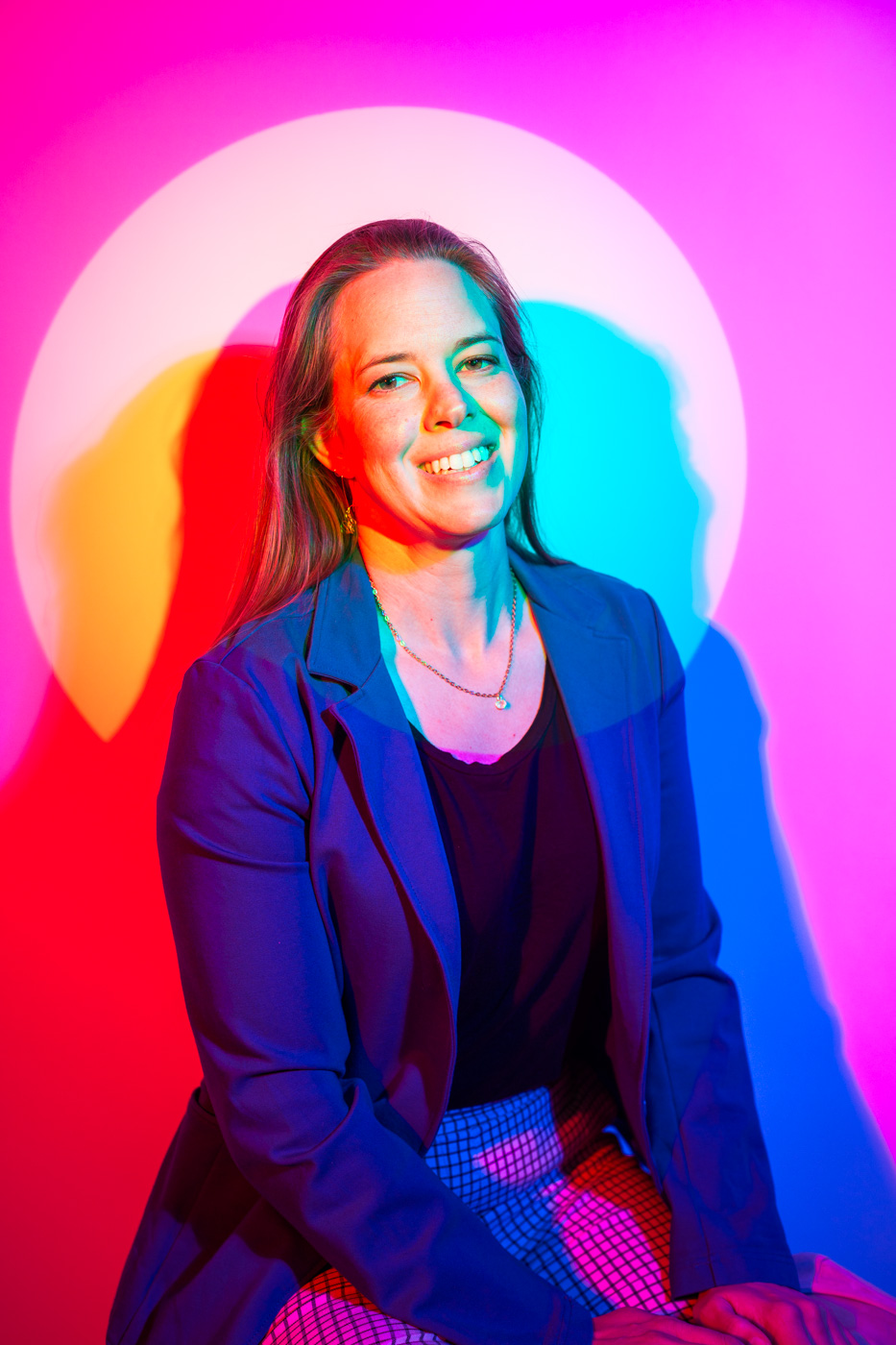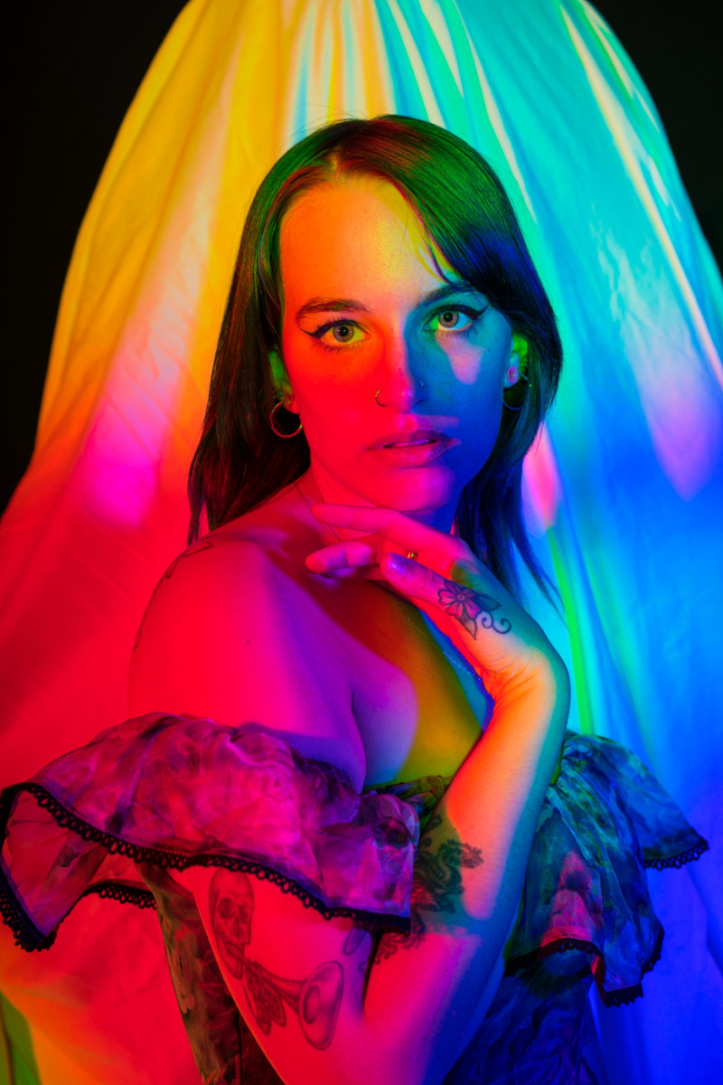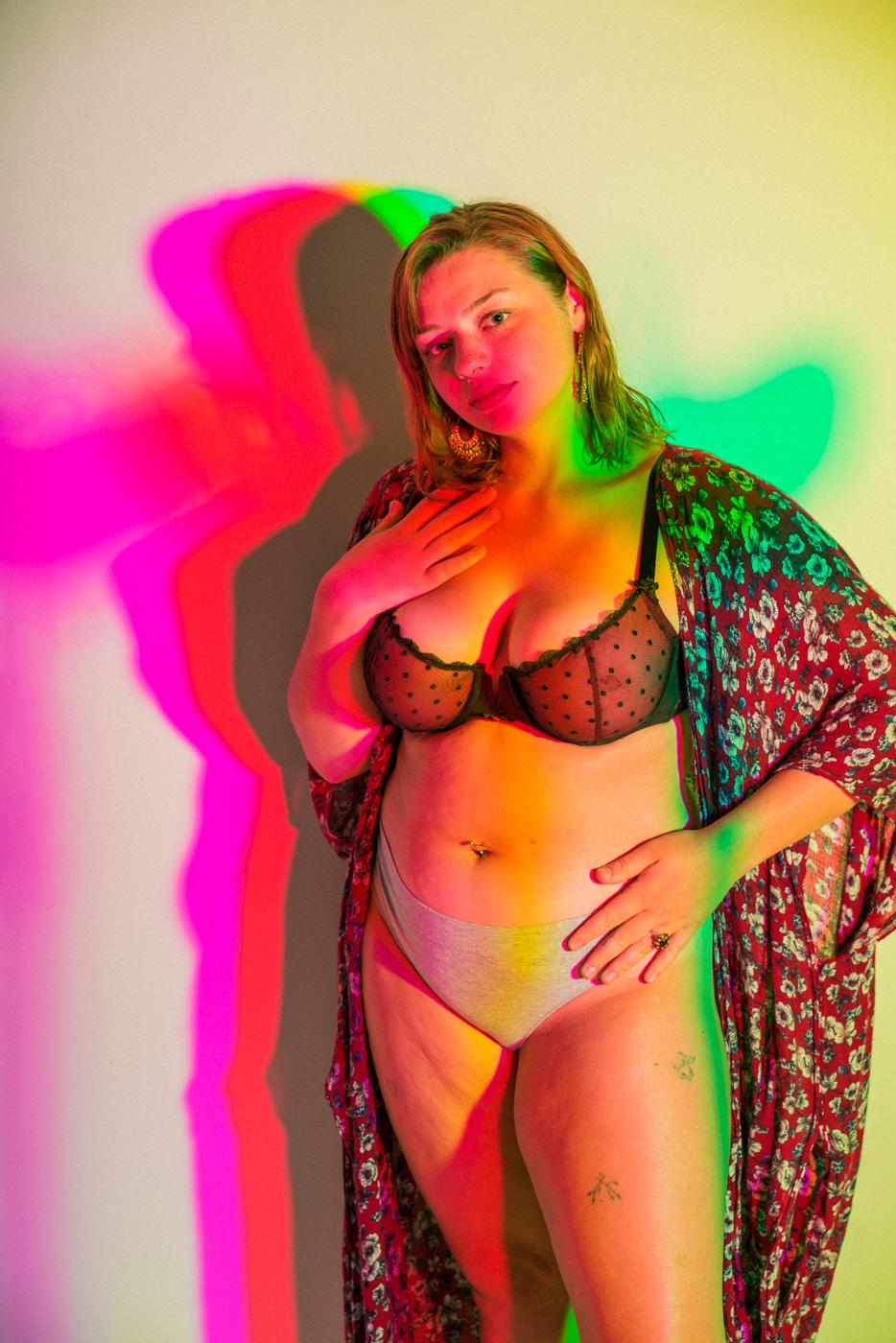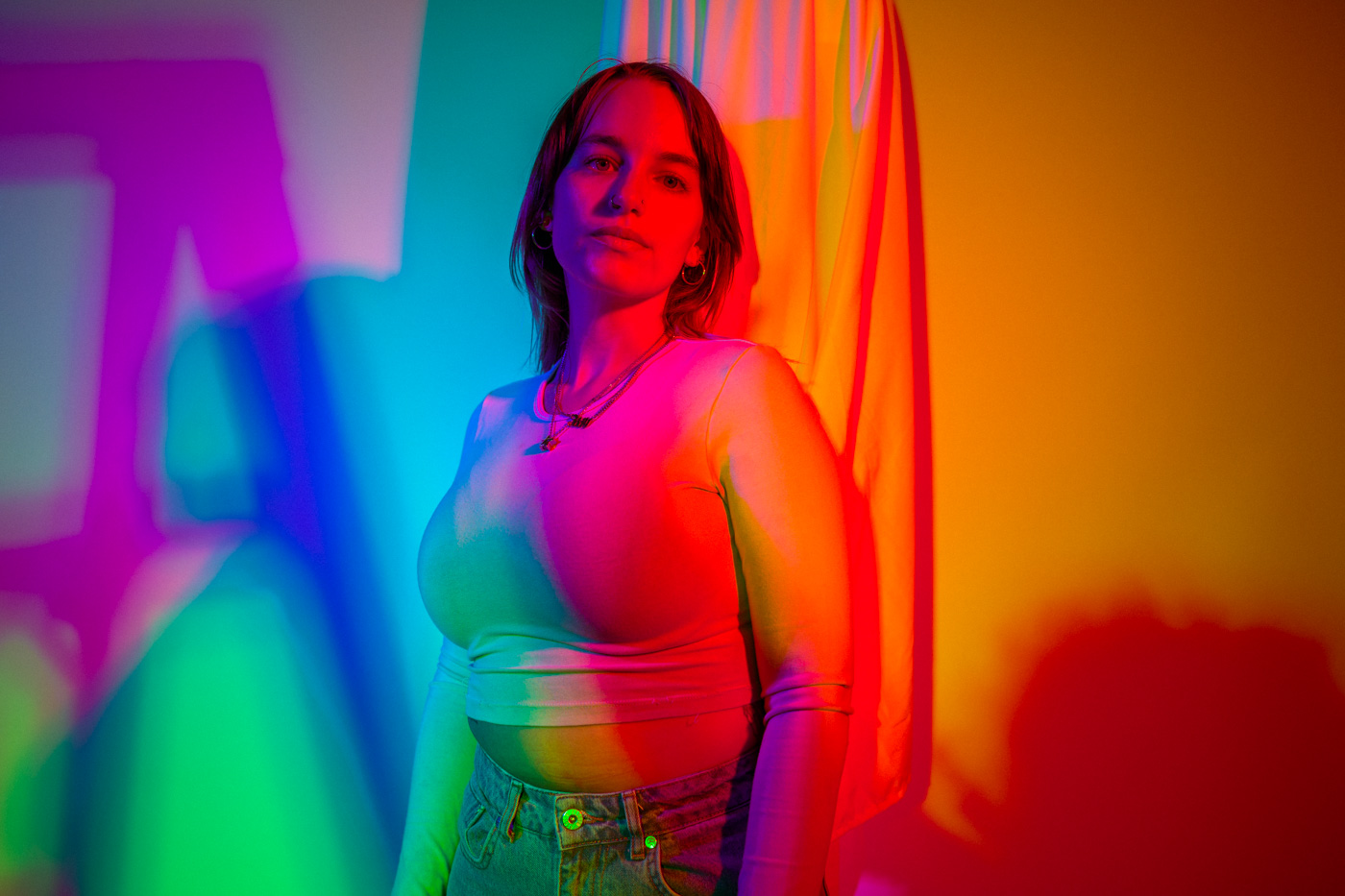 White light, as the human eye understands it, is composed of equal parts red, green, and blue. By isolating and recombining these colors in the studio, I can paint with light itself—an intentionally unstable palette that resists full control. In these portraits, shadows split and recombine, drifting in color around the body and allowing chance to shape the image as much as intention.